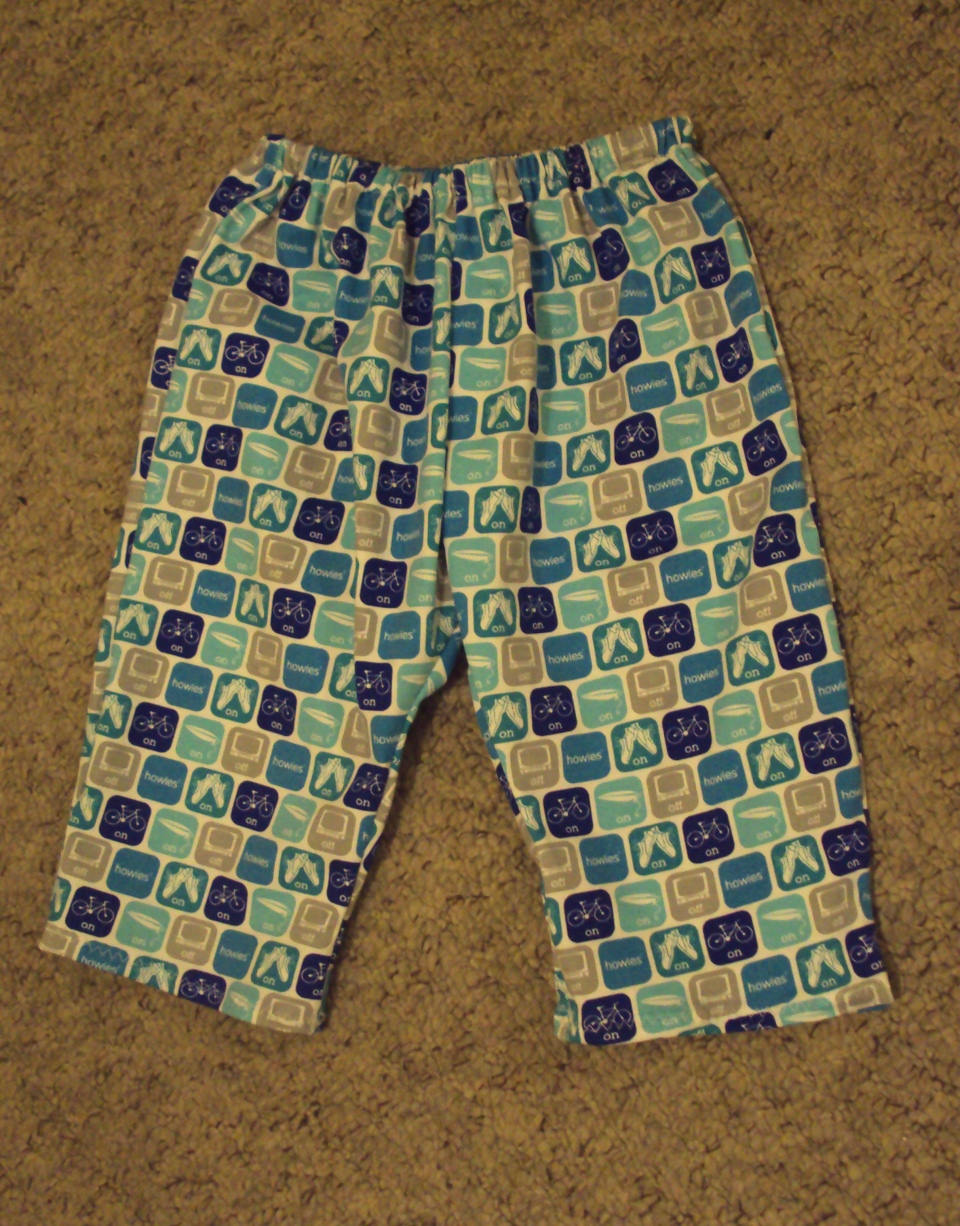 My favourite pair, although arguably the dullest to look at, are the pair pictured above and below. These trousers started out life as a lightweight jumper belonging to my dad. He look a dislike to it for some reason so it got passed on to Patty. However, it was way too big for Patty (not that such a triviality would have prevented him continuing to go to work in it until I insisted he took it off and wore something else that actually looked like it belonged to him!). By that afternoon the jumper in question had become a new pair of Winter trousers for baby Joe. I lined up the bottom edge of the trouser pattern pieces with the bottom edge of the jumper so its ribbing would be included and I wouldn't have to bother finishing the hems of the final trousers.