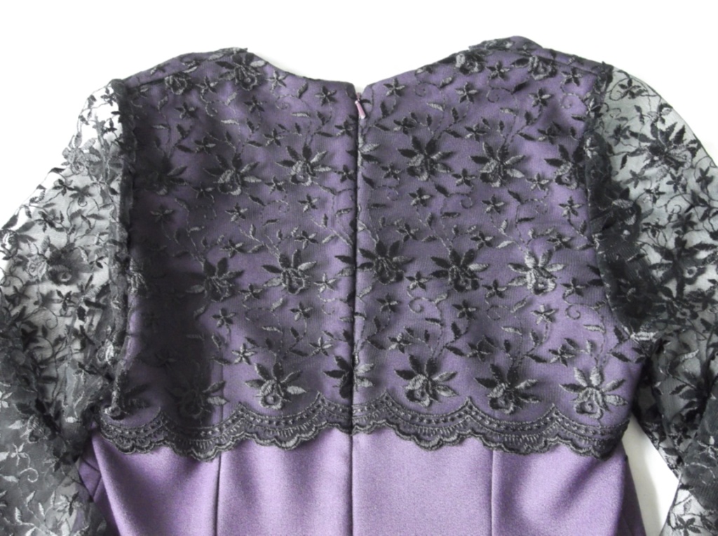 At some point, fairly far into the cutting out and construction of the final garment, my mum had a brain wave. The plan had been to make the sleeves from the same fabric as the rest of the dress and make tiny self-covered buttons to apply to the cuffs and along the top of the centre back. But although the dress was now fitting beautifully, and would doubtlessly be very classic and sleek when finished, Mum was feeling it was a bit plain and not special enough for a very special occasion such as this. From somewhere or other, she had an idea of adding lace sleeves. So off Mum went to an amazing fabric shop on Edgeware Road in London. There she found a fantastic lace in the same colour purple, but at £90 a pop (metre), and requiring over a metre in case of mistakes, it was somewhat outside of her budget, special occasion or no!