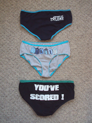 Obvs this comes off the back of the release of my free downloadable pants/undies/knickers pattern that is now available in printable PDF form. It's a very short leap from a pile of unwanted T-shirts (above) to a host of funny new pants (below). Plus, as well all know, sewing isn't always the cheapest of activities. So once you've over-come the small hurdle of getting hold of some underwear elastic (I've found bargains on market stalls and eBay), with a free pattern and an unwanted T-shirt uncovered from a bottom drawer, you've actually got a very cheap little sewing project on your hands.